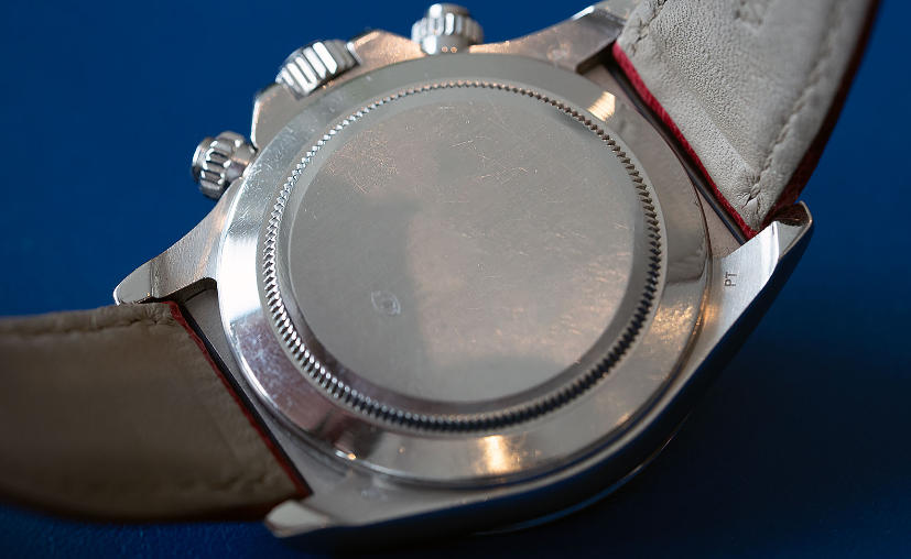 The case is identical to that of the white gold equivalent, except that it is in platinum. Notably, the crown and pushers also appear to be platinum.