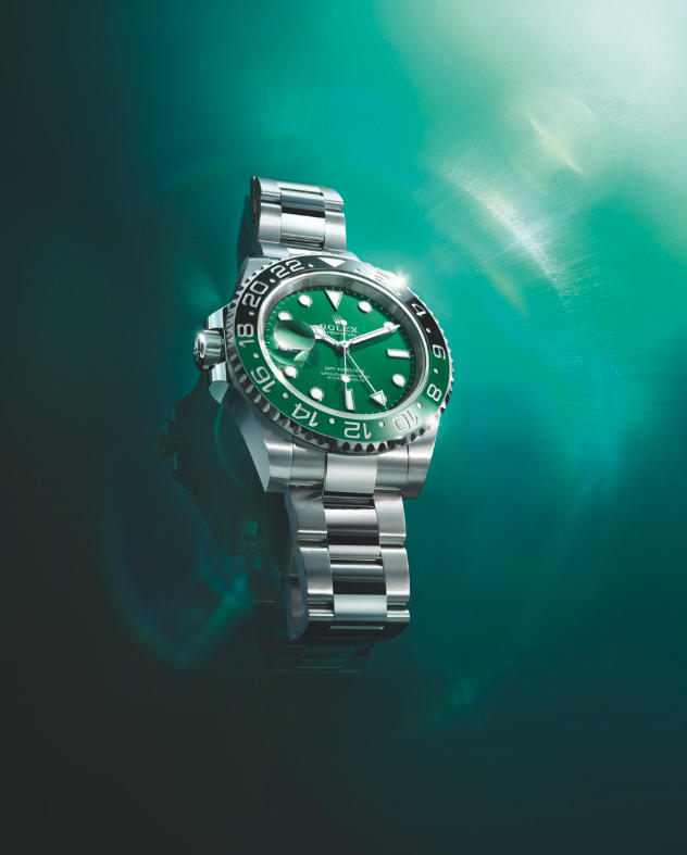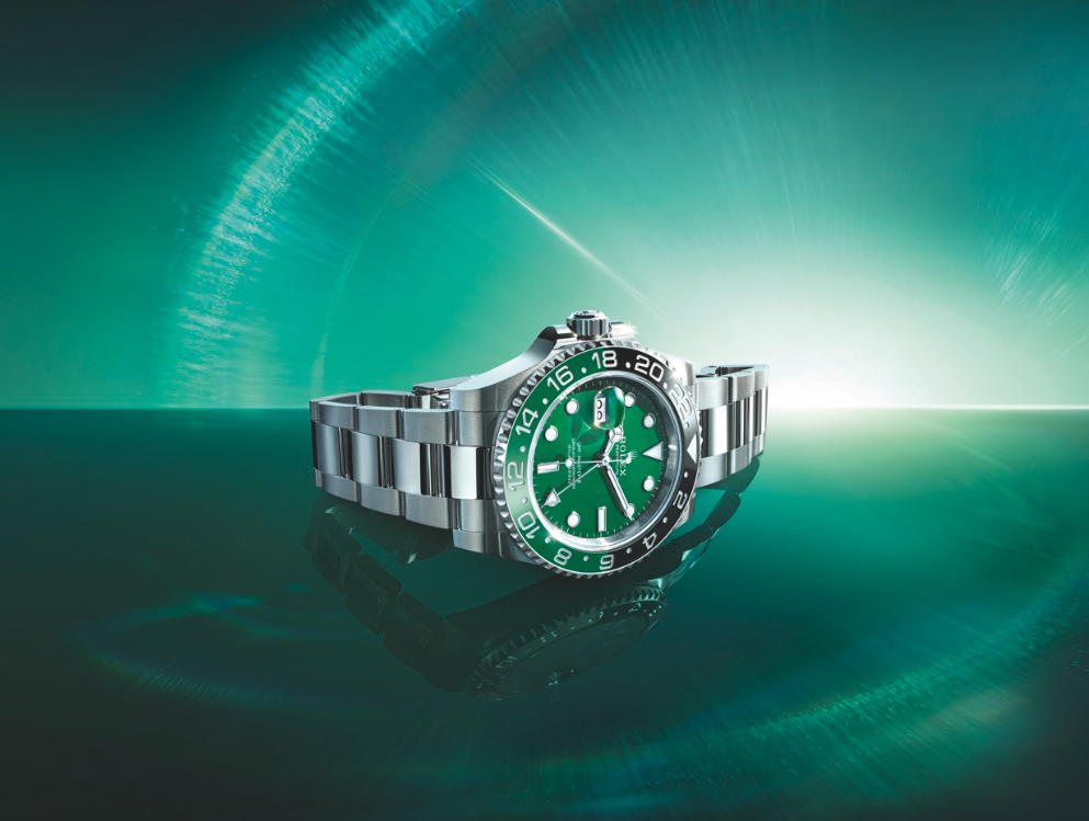 The display also explores how the GMT-Master’s design has continuously evolved without losing its original character. The two-colour bezel, once crafted in Plexiglas and later aluminium, is now rendered in Cerachrom ceramic, prized for its brilliance and resilience. The luminous Chromalight display enhances legibility in low light, while the choice of Oystersteel, yellow Rolesor or 18ct gold bracelets expresses versatility in form and function.